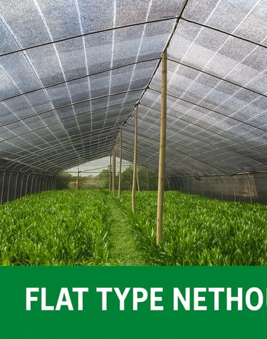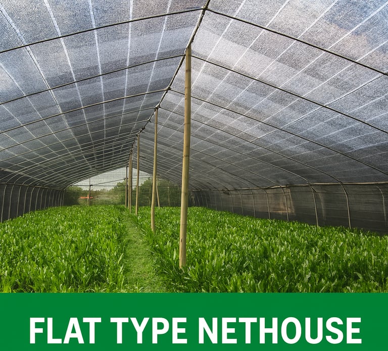 The Flat Type Net House is a simple, affordable, and highly useful protected farming structure designed to protect crops while allowing excellent natural airflow. Built with strong support poles and tensioned wires, the structure holds the shade net firmly in place and creates a safe and healthy growing environment for vegetables, flowers, and nursery plants.