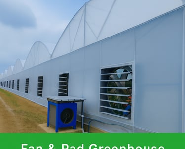 A Fan & Pad Greenhouse is a modern farming structure that helps plants grow in a comfortable and controlled environment, no matter how hot or unpredictable the weather is outside. You can think of it as an air-conditioned house for crops, where temperature, humidity, and fresh air are carefully managed to give plants the best possible growing conditions.