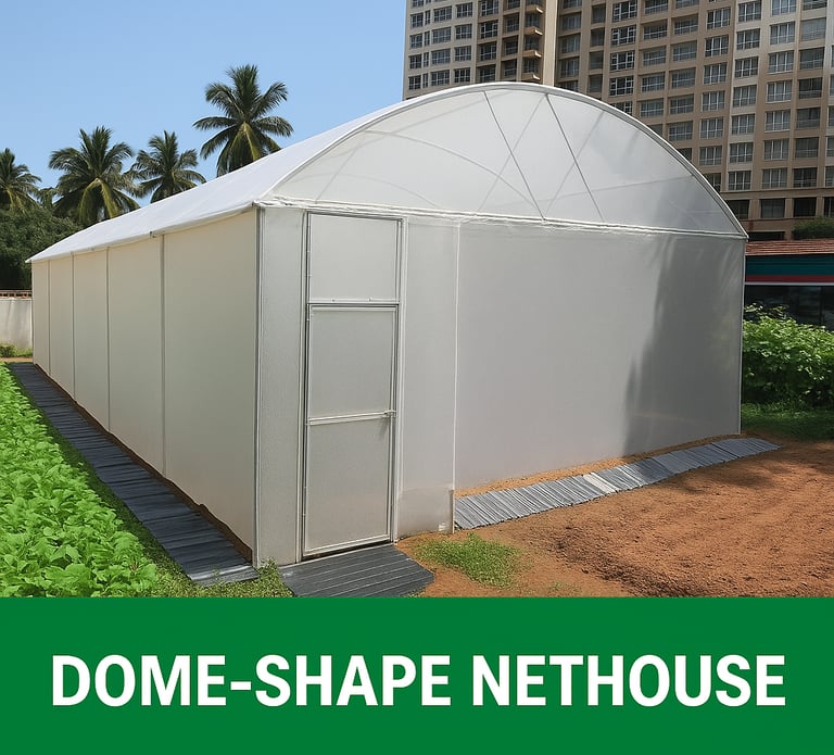 The Dome Shape Net House is a strong, practical, and affordable protected farming structure designed to create a healthy growing environment for vegetables, flowers, and ornamental plants. Its curved dome design makes the structure more stable and long-lasting, while also allowing better air movement and natural temperature control. Because of this, it is a preferred choice for farmers looking for reliable crop protection at a reasonable cost.