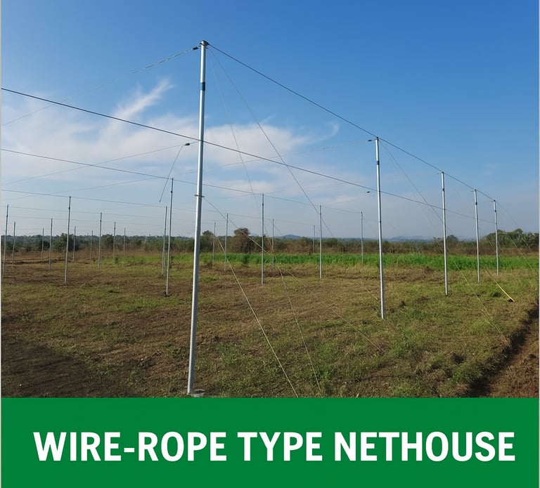 The Wire Rope Net House is a strong, affordable, and practical farming structure designed to help farmers grow crops for a longer period and even support off-season cultivation. It creates a protected environment where important growing conditions—such as sunlight, temperature, humidity, airflow, and root health—can be better managed for steady and healthy crop growth.